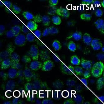 Application of ClariTSA™ Fluorophore Kit 650 in RNAscope™ Multiplex Fluorescent v2 Assay. RNAscope™ Multiplex Fluorescent v2 Assay on HeLa cells with the leading competitor dye (left) and ClariTSA™ Fluorophore Kit 650 (right). Dye used at 1:1500 dilution. Marker shown is UBC in white. Nuclei are counterstained with DAPI (blue, Catalog # 5748, Tocris).