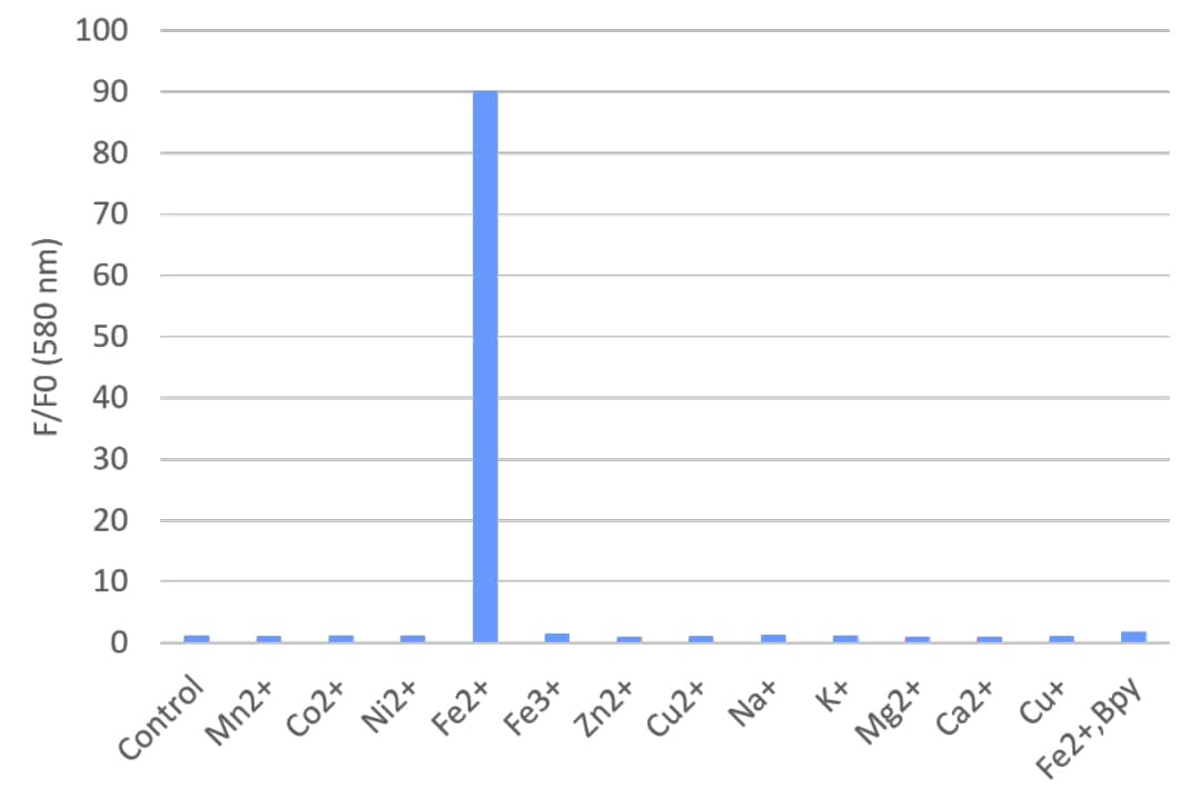 Submit ReviewKey information: FerroOrange (RhoNox-4) is a highly sensitive and robust fluorogenic probe for the detection of intracellular labile Fe(II). FerroOrange displays weak absorption and low fluorescence in the visible region, but becomes strongly fluorescent upon reaction with Fe(II).