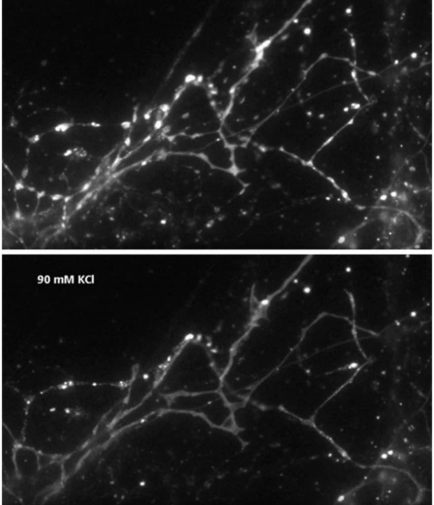 Application of FFN 200 dihydrochloride in Cultured Dopamine Neurons. FFN 200 dihydrochloride in vesicle clusters in axons of cultured dopaminergic neurons (top image), and exocytosis upon high potassium stimulation (bottom image).