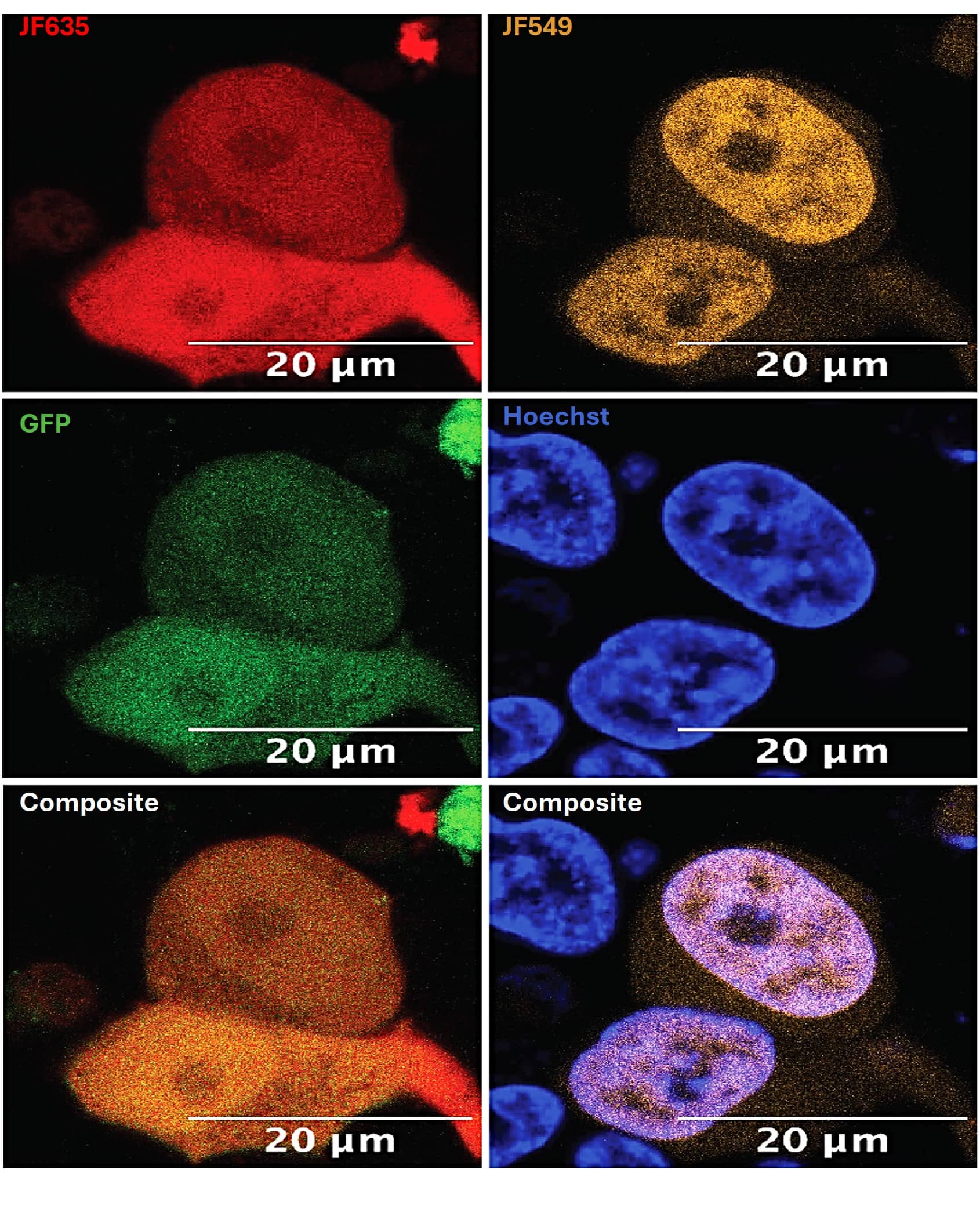 Multiplexed fluorescence imaging of HEK293 cells expressing GFP-BromoCatch™ and H2B-HaloTag®. Cells were labeled with Hoechst 33342 (Cat# 5117), Janelia Fluor® 635, BromoCatch™ Ligand (Cat# 8937), (1µM), and Janelia Fluor® 549, Haloalkane (Cat# 8806), (100 nM). Intrinsic GFP fluorescence provides an orthogonal channel confirming GFP-BromoCatch™ expression, demonstrating robust multichannel compatibility in live-cell imaging.