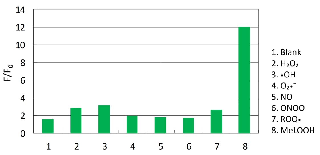 Reaction selectivity of Liperfluo against various reactive oxygen species (ROS). Relative fluorescence intensity (F/F0) of Liperfluo with various ROS in ethanol. Liperfluo (1 mM) was reacted with various ROS (5 mM) for 30 min at room temperature. F0 and F denote fluorescence intensity at 535 nm before and after the addition of various ROS, respectively.