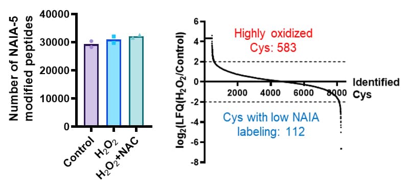 Application for NAIA. HepG2 cells were treated with solvent vehicle, H2O2 (1 mM) or H2O2 (1 mM) + NAC (5 mM) in a serum-free medium for 15 min at 37 °C. The cells were then incubated with NAI (50 µM; 10 min) to label-free thiols in live cells, followed by cell lysis and TCEP (1 mM) reduction for 1 h. After acetone precipitation at -20 °C overnight, the proteins were labeled by NAIA-5 (100 µM) in PBS. The samples were then prepared for MS and analyzed by LC-MS/MS.